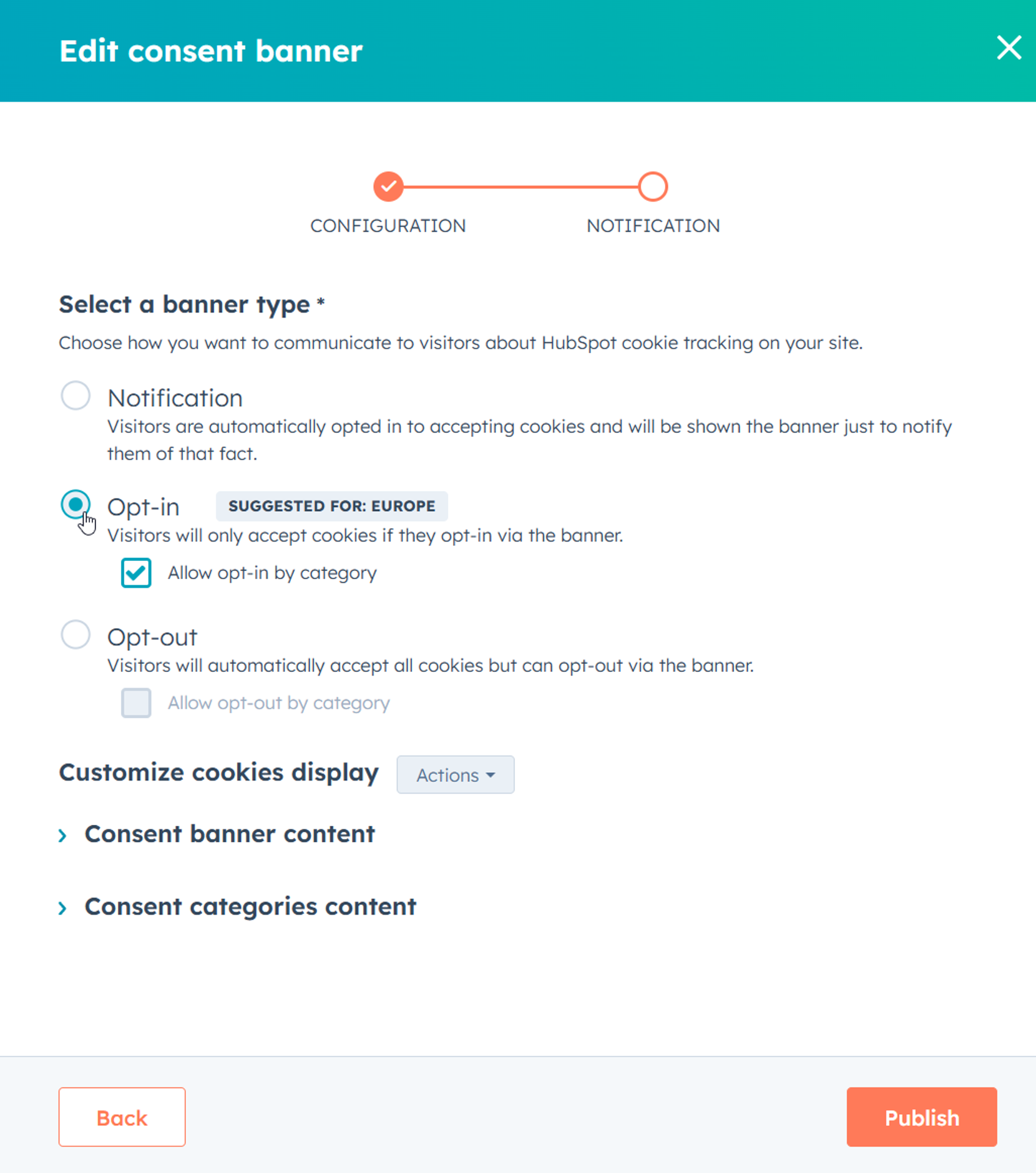 When configuring the banner, it is important to ensure that the Banner Type is set to Opt-in, and that the option Allow opt-in by category is enabled.