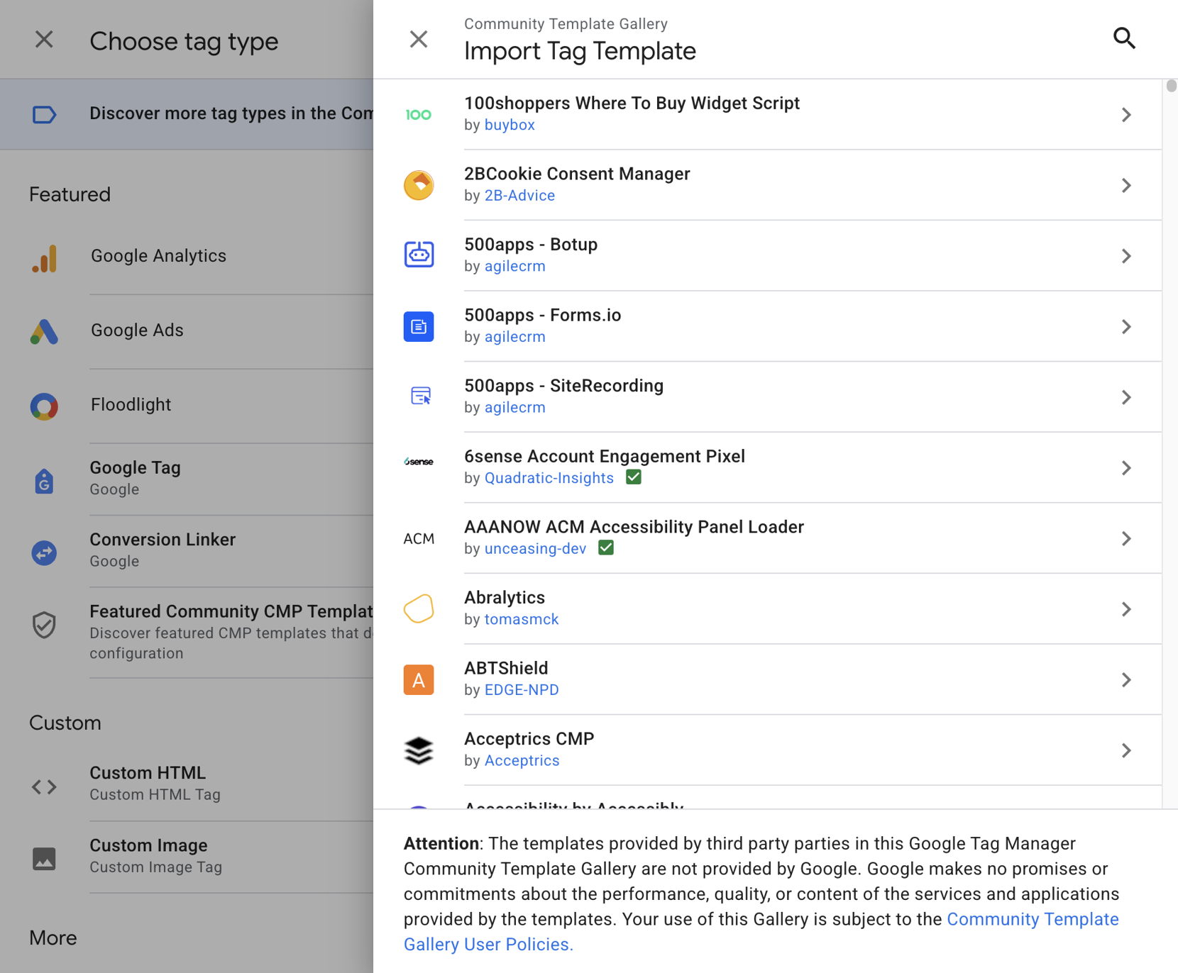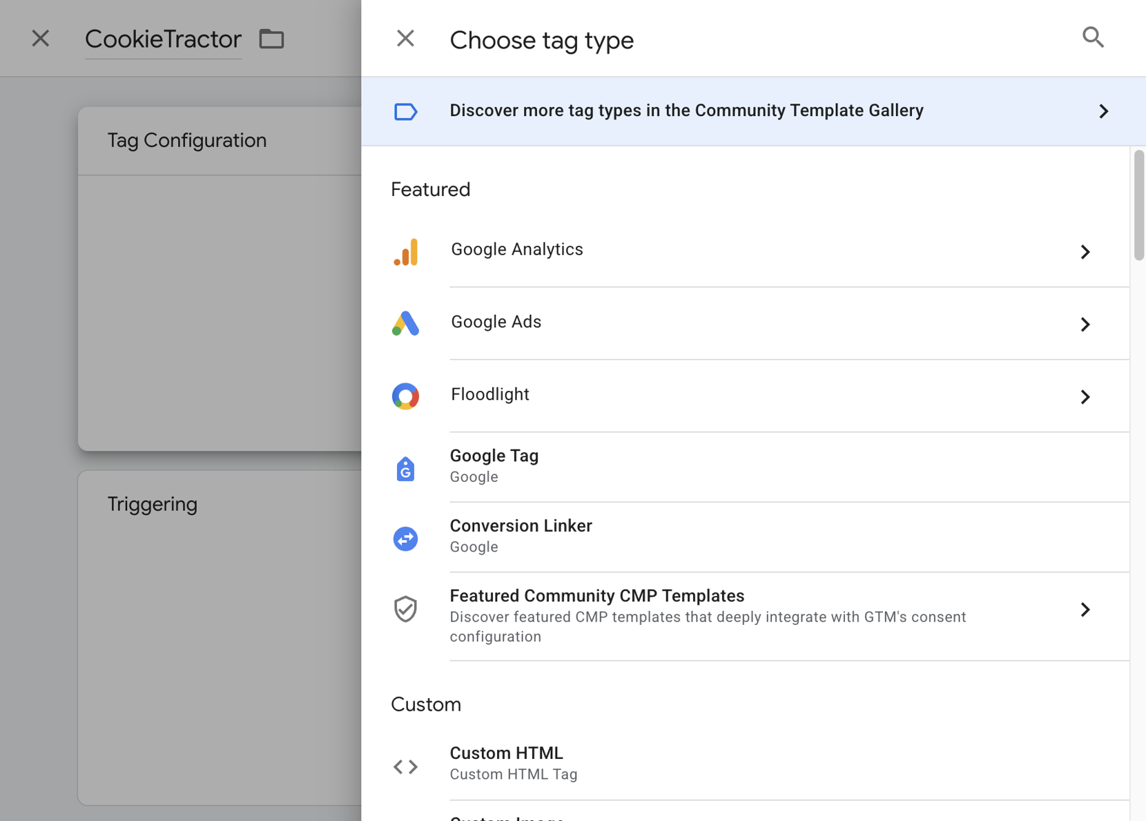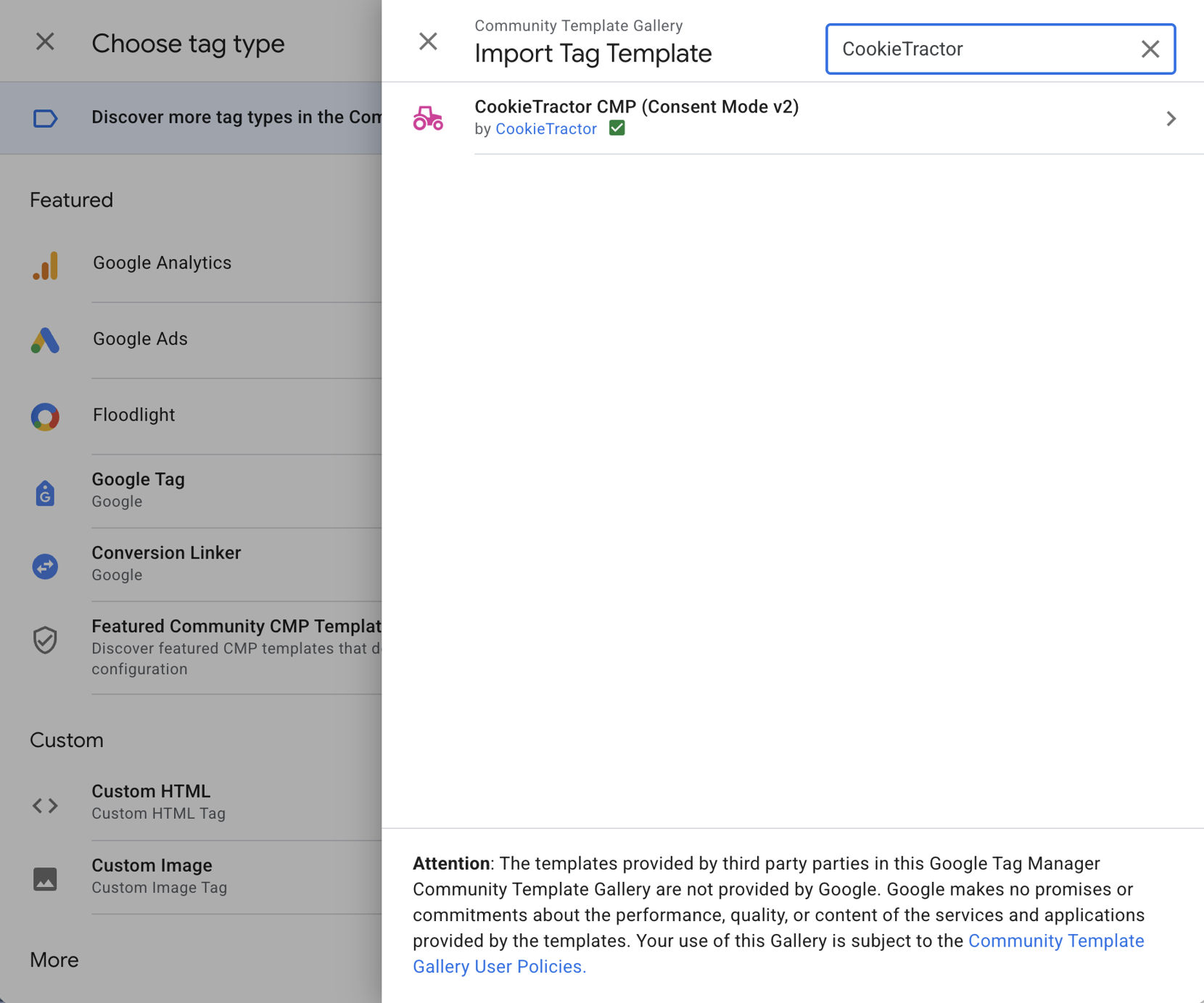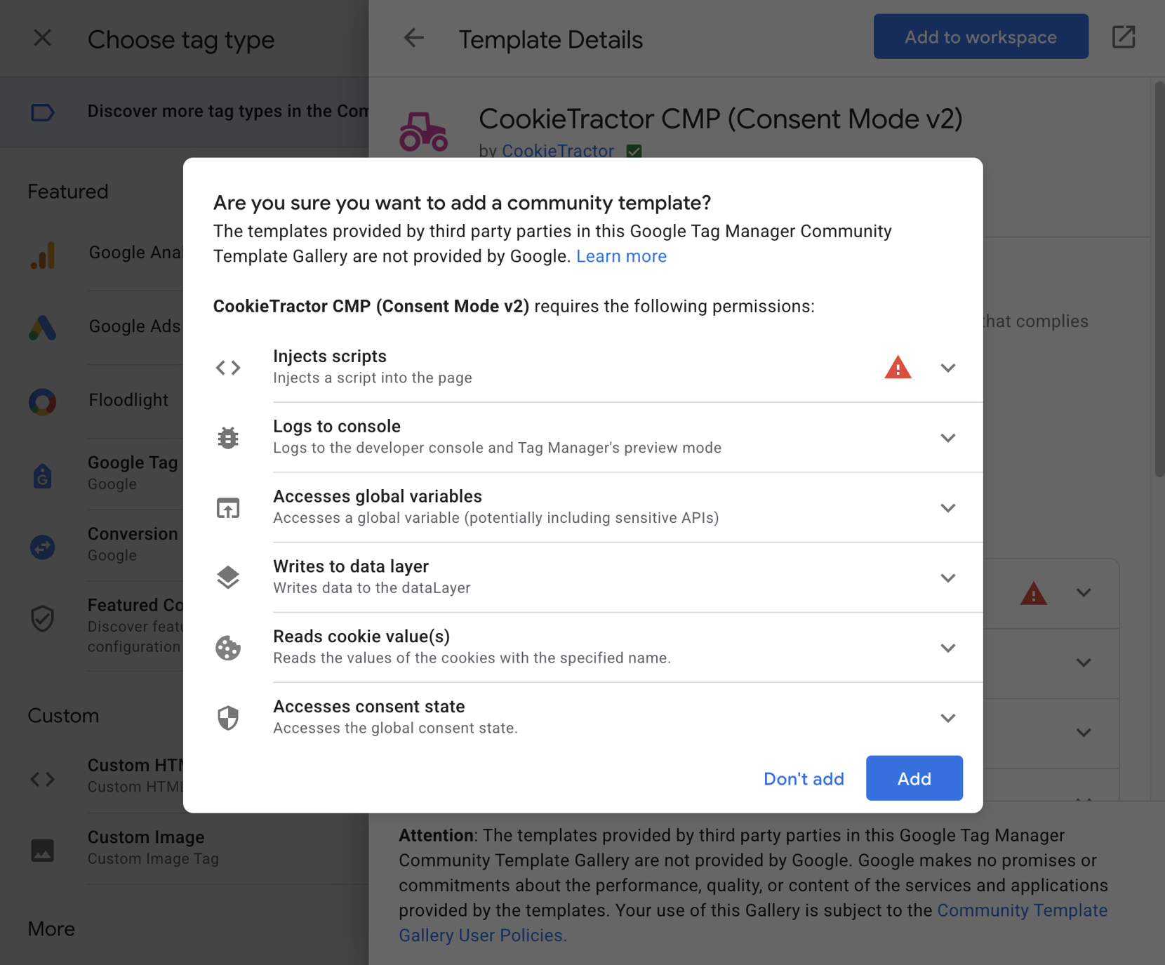 Click on Tag Configuration and open the Community Template Gallery. In the Import Tag Template dialogue, search for CookieTractor and add it by clicking the Add to workspace button. A warning will appear indicating that a script will be inserted into the tag – this is expected.