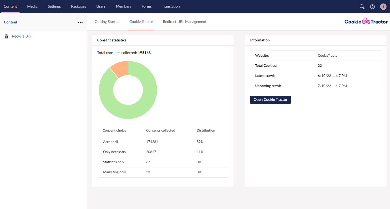 Inside Umbraco, right after logging in, you'll find our dashboard under the Content section. Look for the CookieTractor tab.