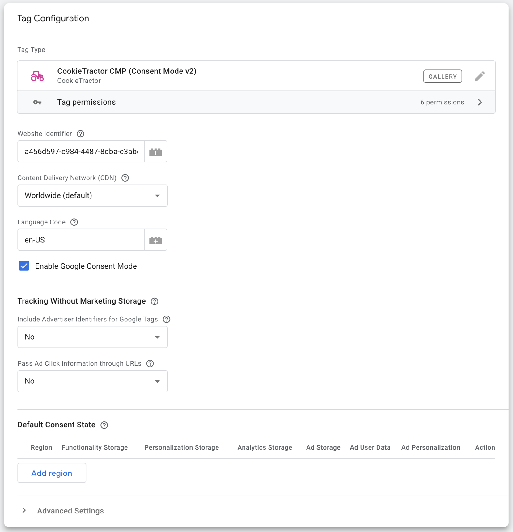 When CookieTractor is installed you can configure it so that compatible products respond to Google Consent Mode - this is referred to as Advanced mode.