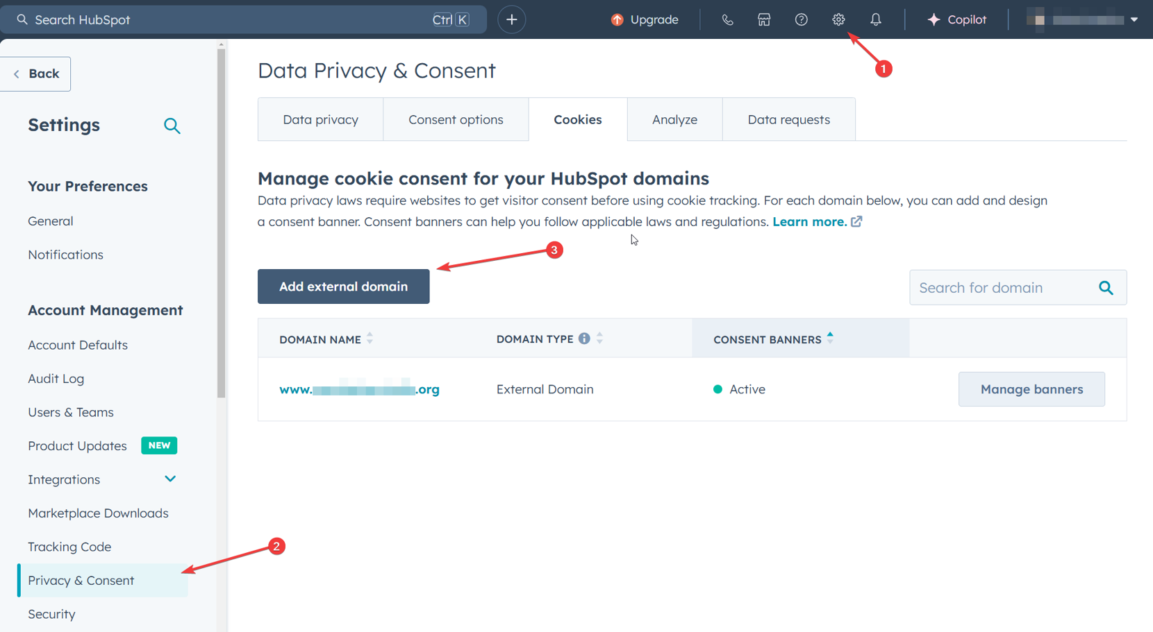 Log in to your HubSpot account and navigate to the Data Privacy & Consent settings section: